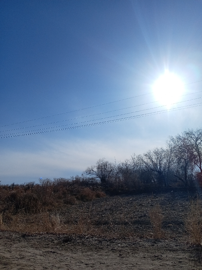 The scene, located in Chimbay, Uzbekistan, depicts an outdoor environment under bright daylight. The upper half of the image features a clear, deep blue sky with a brilliant, overexposed sun positioned in the upper right quadrant. Four parallel, dark-colored utility lines traverse the sky diagonally from the mid-left towards the upper right, passing below the sun. A narrow band of diffuse white clouds is visible below the utility lines, extending horizontally across the mid-sky. The middle ground is characterized by a line of dormant, leafless trees and dense, dry brown shrubbery and grasses, suggesting a late autumn or winter season. The trees on the right are taller and more distinct, while the vegetation on the left is lower and denser. The foreground consists of dark, uneven ground composed of soil and scattered small stones, with sparse patches of dry, brown weeds and grasses. No individuals, animals, or specific actions are discernible within the frame.
