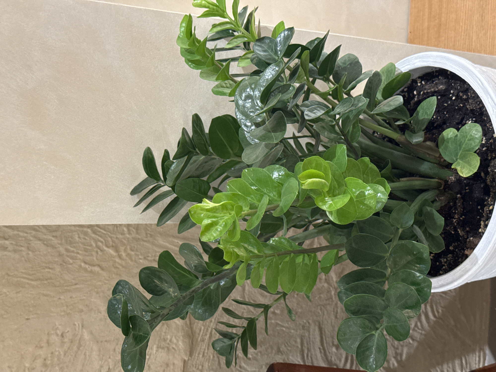 green ZZ plant in a white pot placed indoors near a wall