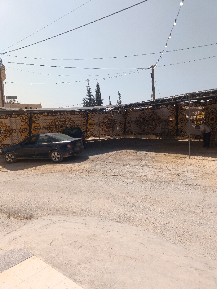The image captures an outdoor scene in Al-Kum, Palestinian Territory, under a clear, light blue sky. The foreground consists of a light-colored concrete or paved surface, which transitions into a ground composed primarily of light-colored gravel and packed dirt that extends into the midground. On the left side of the gravel area, a dark, four-door sedan, appearing worn, is parked with its front facing towards the left. A second dark vehicle is partially visible behind the sedan, positioned beneath a large canopy structure. This canopy structure dominates the right side of the image. It features a dark metal frame, and its interior perimeter is lined with decorative fabric panels. These panels display repeating patterns of yellow and gold medallions or mandalas against a darker background. A single adult male is visible on the far right, standing near the decorated fabric wall of the canopy. He is wearing a light-colored shirt and dark trousers, facing towards the right of the frame. Overhead, multiple dark utility wires crisscross the upper portion of the scene. A string of exposed incandescent light bulbs extends diagonally from a dark, vertical pole (likely a utility or support pole) towards the upper left. In the background, beyond the canopy and vehicles, several light-colored buildings with flat roofs are visible, accompanied by a cluster of dark green coniferous trees.