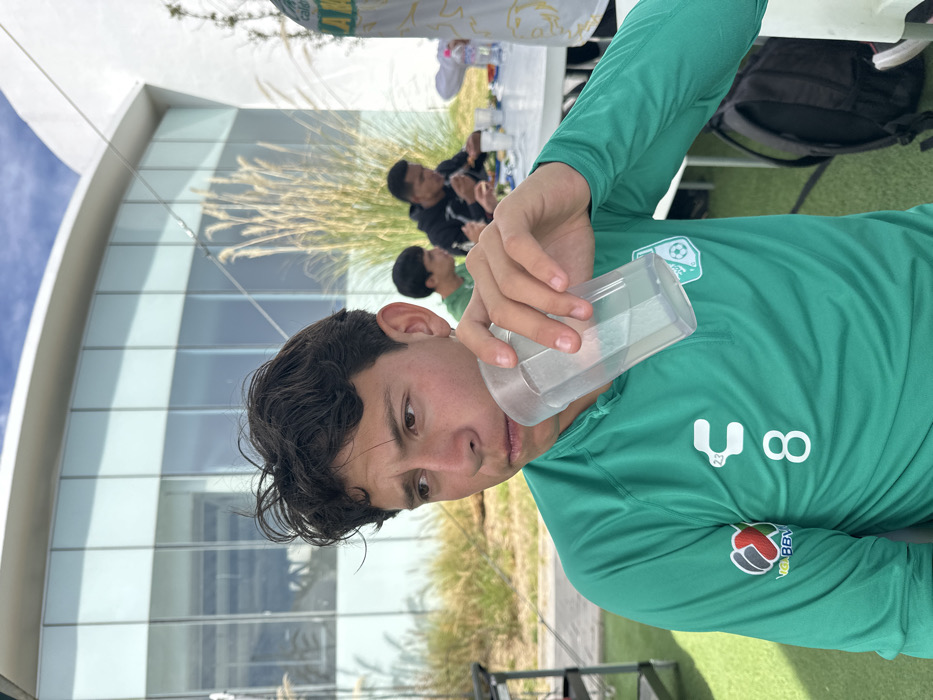 A young man in a green soccer jersey is drinking from a clear plastic cup. He has dark hair and brown eyes. The jersey has a logo on the chest and "U8" printed on the sleeve. Behind him, two other people are eating at a table with a white tablecloth. Tall grass and a modern building are visible in the background. The photo is taken outdoors in daylight.