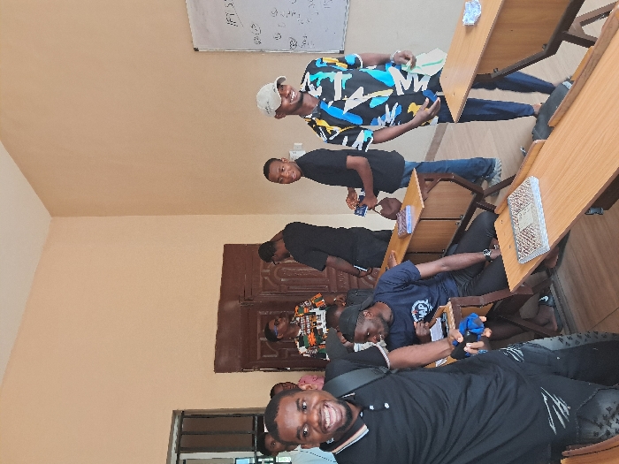 This image depicts an indoor scene in Ihiagwa, Nigeria, featuring a group of approximately ten young adult males within what appears to be a classroom or common room