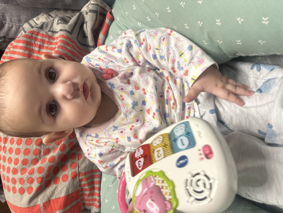 A baby wearing a floral patterned onesie lies on a surface with varied textiles. The baby's head rests on a red and grey patterned cloth. A mint green pillow is behind their upper body, and a white and blue cloth covers their legs. The baby has large, dark eyes and is looking directly at the camera. They are holding a white and colorful musical toy with a pink handle.