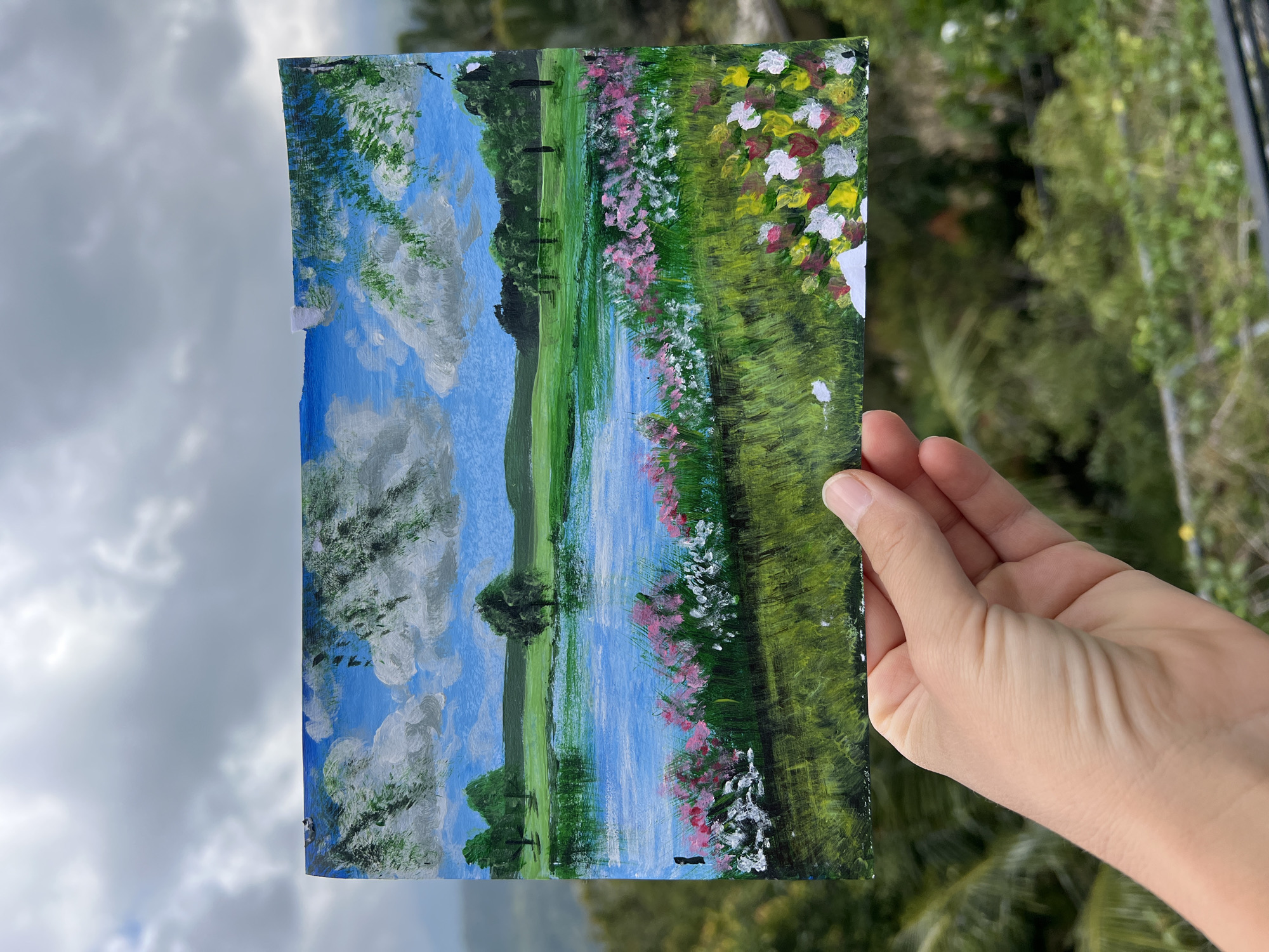 A hand holds a rectangular painting outdoors. The painting depicts a landscape with a blue sky, white clouds, a body of water reflecting the sky, green trees, and colorful flowers. The background shows blurred greenery and a cloudy sky. The location is Unknown, Indonesia.
