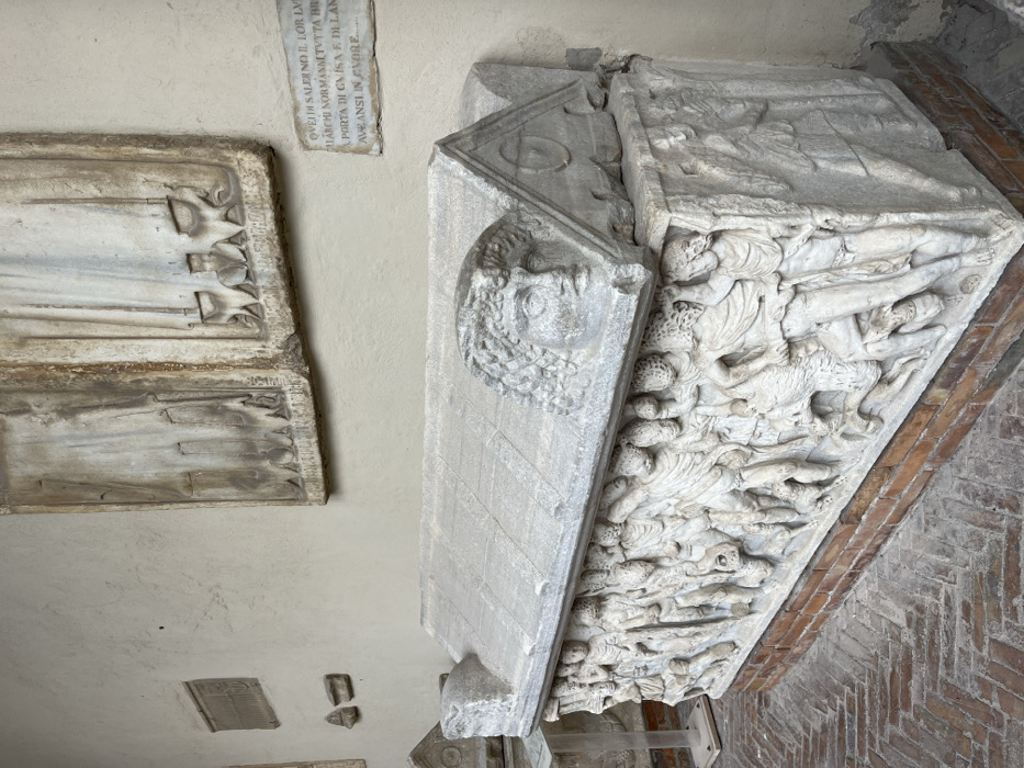 This image depicts an ancient marble sarcophagus on display indoors at the Museo Archeologico Provinciale di Salerno, Italy