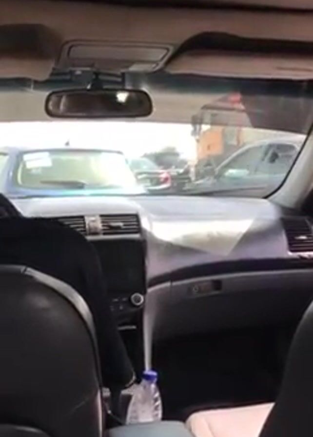 A car's interior is viewed from the back seats, looking forward through the windshield. A driver is visible in the front seat, wearing a dark top. The dashboard is gray, and a small screen is visible in the center console. A water bottle sits in a cup holder. Outside the car, a line of other vehicles is visible, including cars and a large orange truck. The scene appears to be a traffic jam. The speaker says "enter", "enter", "enter".