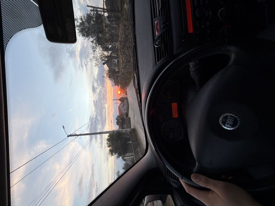 - "The image displays a first-person perspective from the driver's seat of a vehicle, looking forward through the windshield at a sunset scene in a rural or semi-rural area of Peso da Régua, Portugal" by FM-XZbV72, licensed under CC BY 4.0