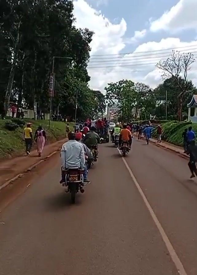 celebratory scene on a city street, presumably in Kenya, with people on foot and motorcycles
