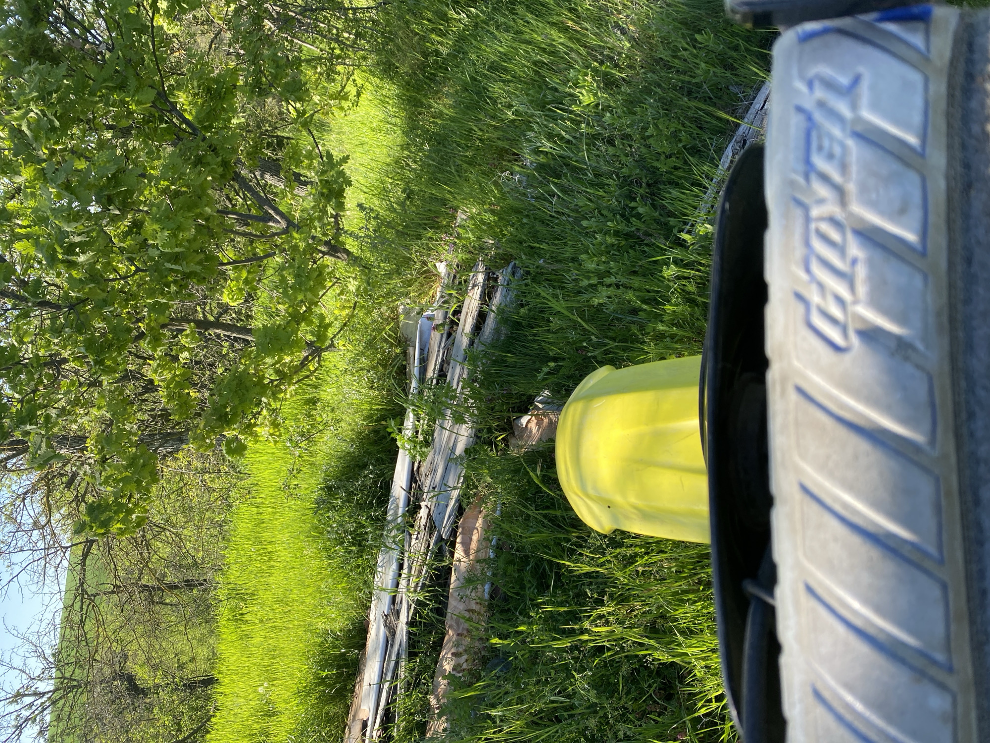 n outdoor scene in Konstantinovo, Bulgaria. A yellow plastic container sits in a grassy area beside some corrugated metal sheets. The tire of a vehicle is in the right corner of the image. A tree with green leaves is visible in the left. The environment consists of grass and vegetation.
