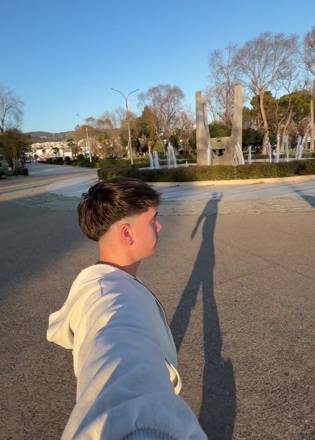 A young man stands on a paved pathway in what appears to be a park, holding the camera and looking to the right. He is wearing a white t-shirt and a light gray zip-up hoodie. His shadow stretches long in front of him due to the sun's angle. Behind him is a roundabout with a fountain in the center. Several jets of water are spraying upwards from the fountain. Trees with bare branches surround the area. In the background, there are buildings and a hill or small mountain visible under a clear blue sky. The scene appears to be captured in the late afternoon or early morning due to the long shadows.