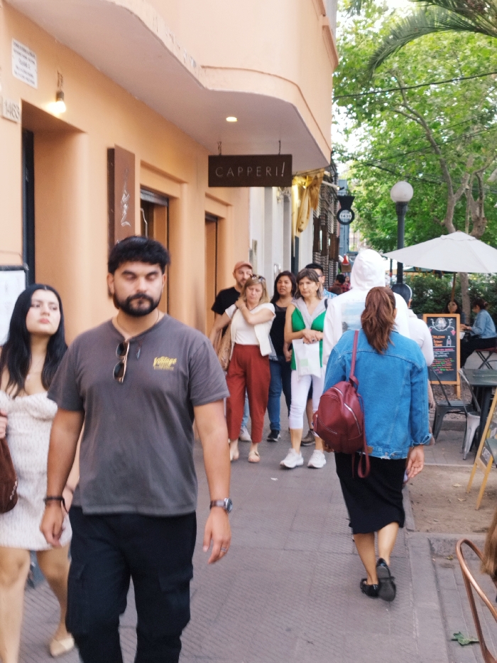 A daytime outdoor shot depicts a crowded sidewalk scene. Several people are walking along the walkway, including a bearded man in a gray t-shirt and black pants in the foreground. Behind him, a woman in a denim jacket and black skirt is walking in the same direction. Others appear to be waiting in line outside a building with a sign reading "CAPPERI." Trees and a white umbrella are visible in the background.