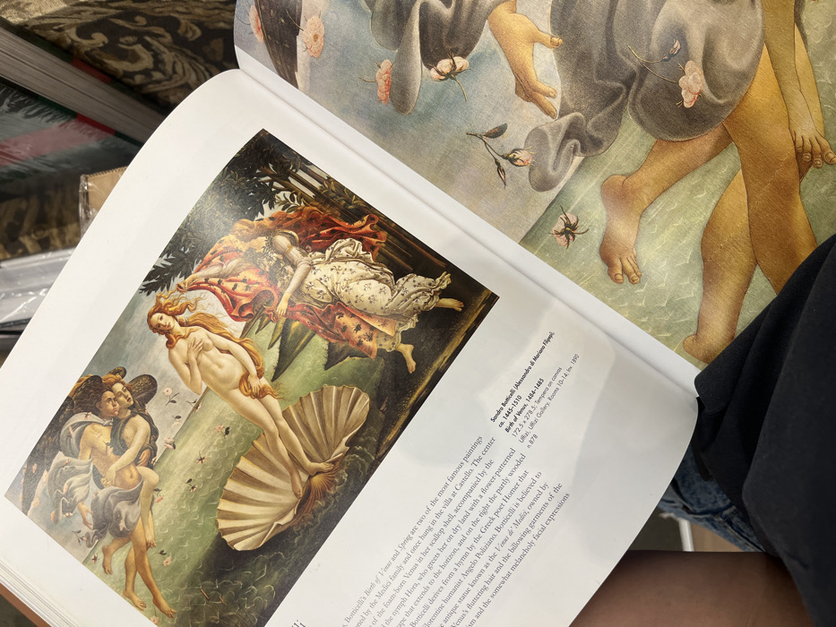 An open art history book, held on a person's lap, displays reproductions of classical artworks