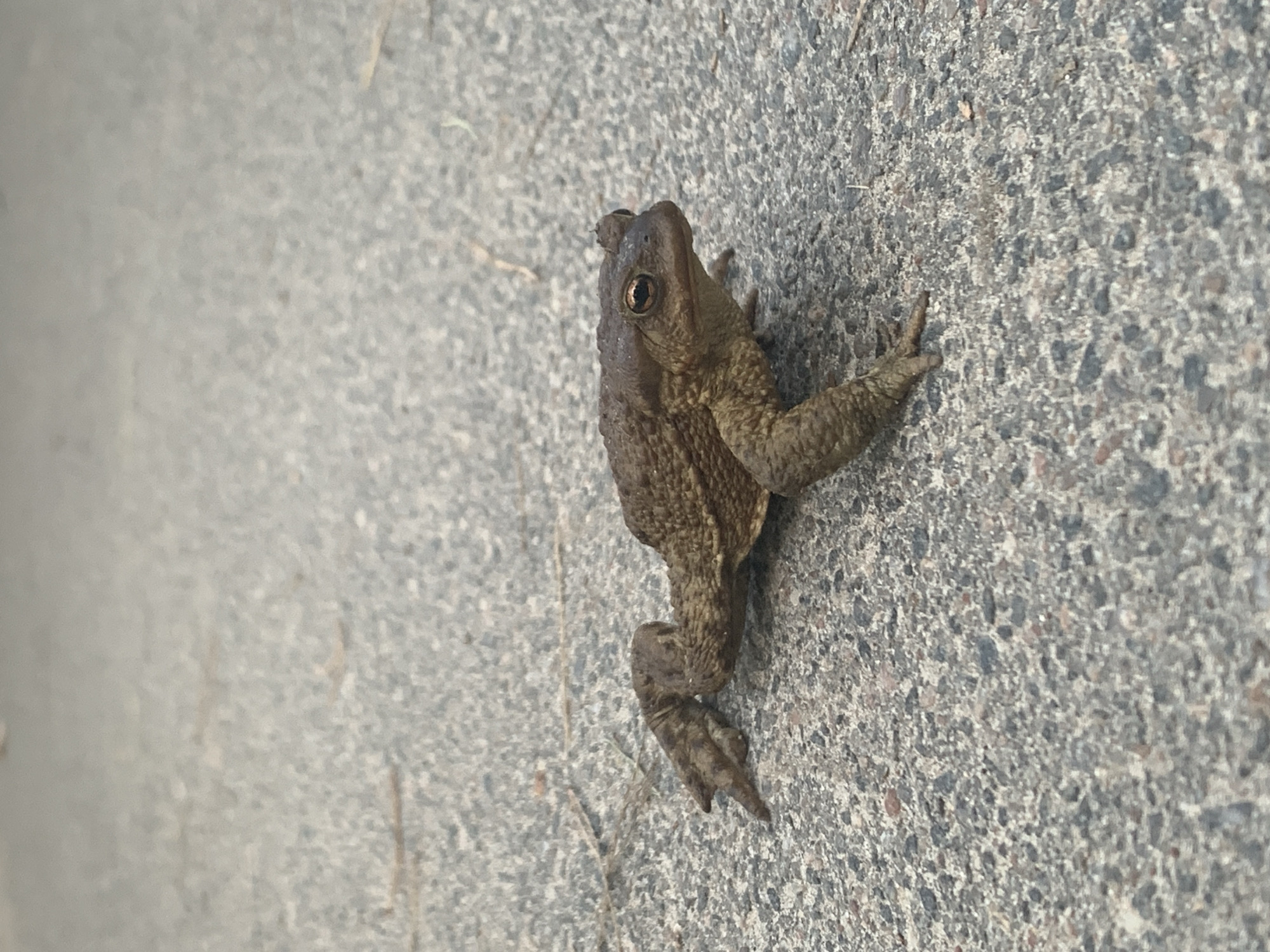 A top-down, slightly angled shot shows a small, brown toad on a grey concrete surface