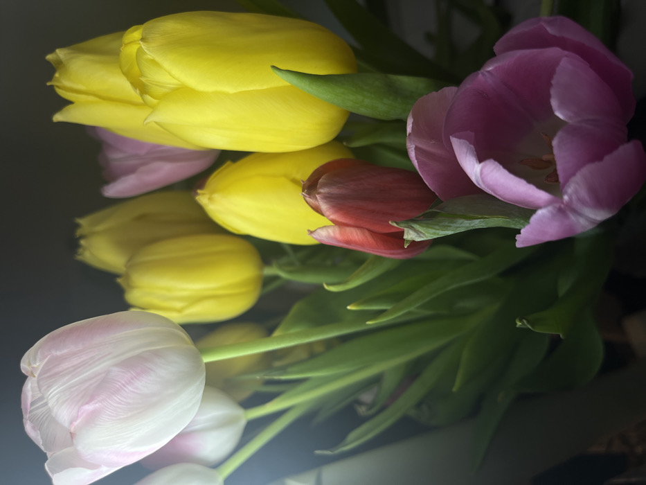 - "A close-up, high-angle view captures a bouquet of multi-colored tulips against a dark, featureless background" by FM-3vT0d2, licensed under CC BY 4.0