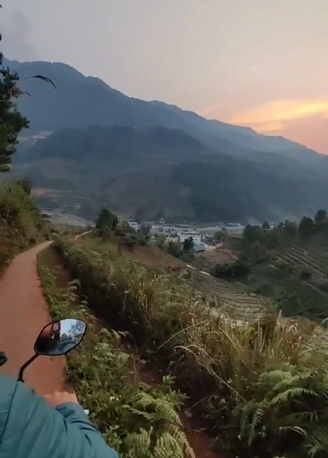 person riding a motorbike on a dirt road, apparently in the mountains. The road is narrow and unpaved. There's vegetation on both sides of the road. The landscape has mountains and a small village visible in the distance. The sky is partly cloudy with a sunset glow on the horizon. The rider is wearing a jacket and a purple helmet.