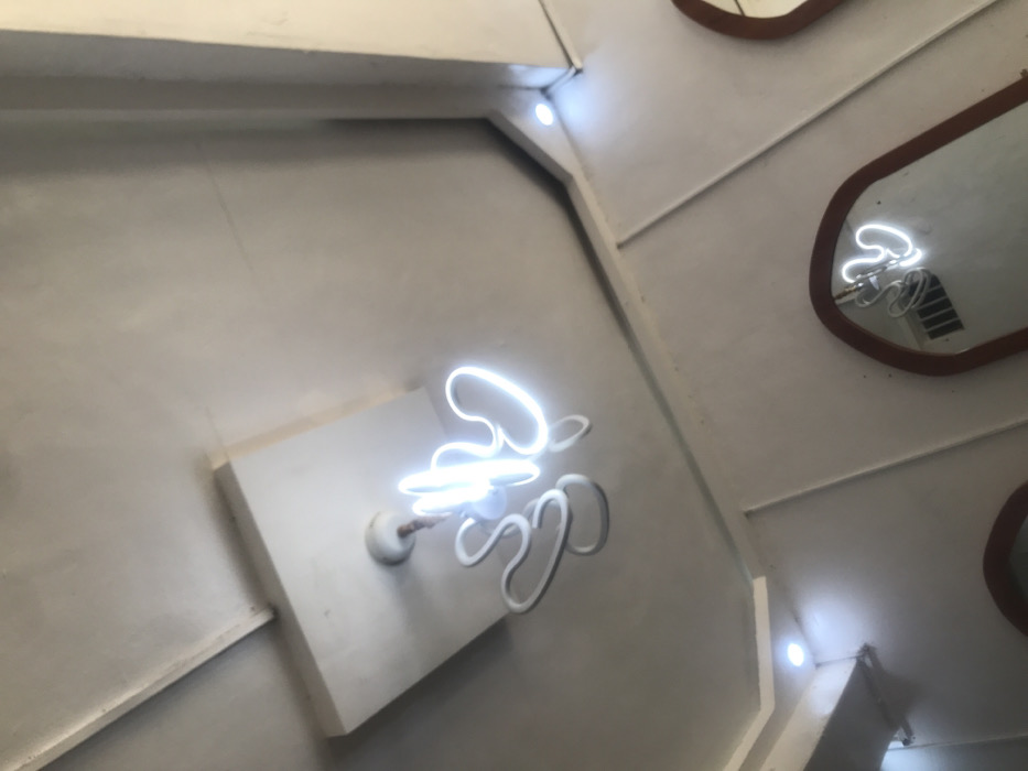 The image depicts an interior space on Rukuba Road, Nigeria, specifically focusing on the ceiling and upper wall sections. A central white, abstract-shaped neon or LED light fixture, composed of looping, tubular elements, hangs from a rectangular white panel recessed into the main white ceiling. The ceiling features geometric molding and two visible recessed spotlights emitting a cool white light. The upper walls are white with vertical decorative molding. Two arched mirrors with brown wooden frames are partially visible; one on the right reflects the main light fixture, and another is partially seen in the bottom left. The reflection in the right mirror also shows what appears to be a vent or grill. No individuals are present. The scene is brightly illuminated by artificial light sources.