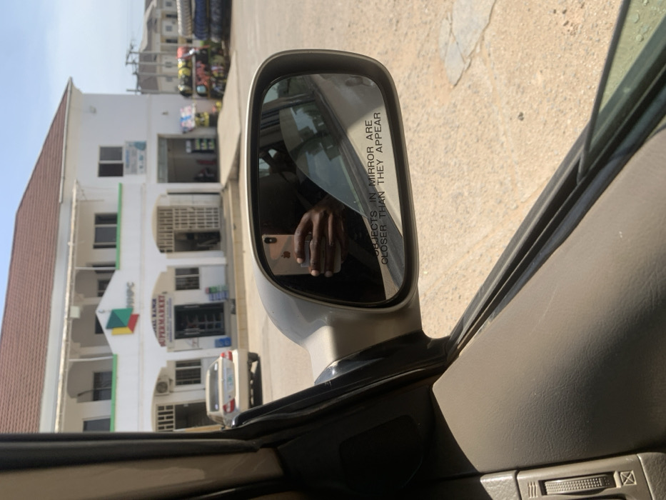 The image presents an urban street scene in Gwarinpa, Nigeria, captured from the interior perspective of a vehicle's passenger side on a bright, sunny day