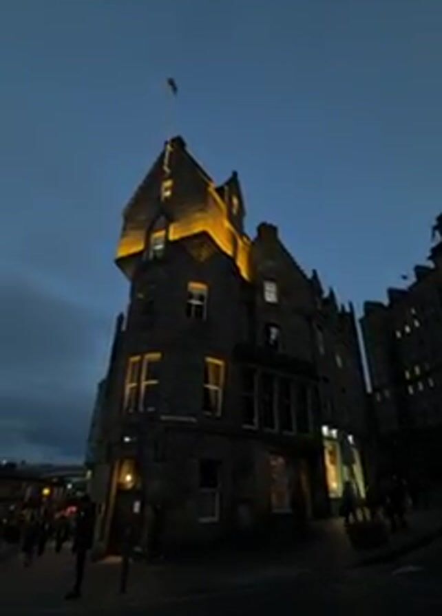 low-angle view of a stone building at dusk. The building features a prominent tower illuminated with warm yellow light at the top. A flag waves on the tower's peak. The sky is a deep blue, hinting at twilight. Other buildings are visible in the background, suggesting an urban setting. People are walking along the street in the foreground, though they appear as silhouettes due to the low light. The scene is predominantly dark, with the illuminated tower serving as the focal point.