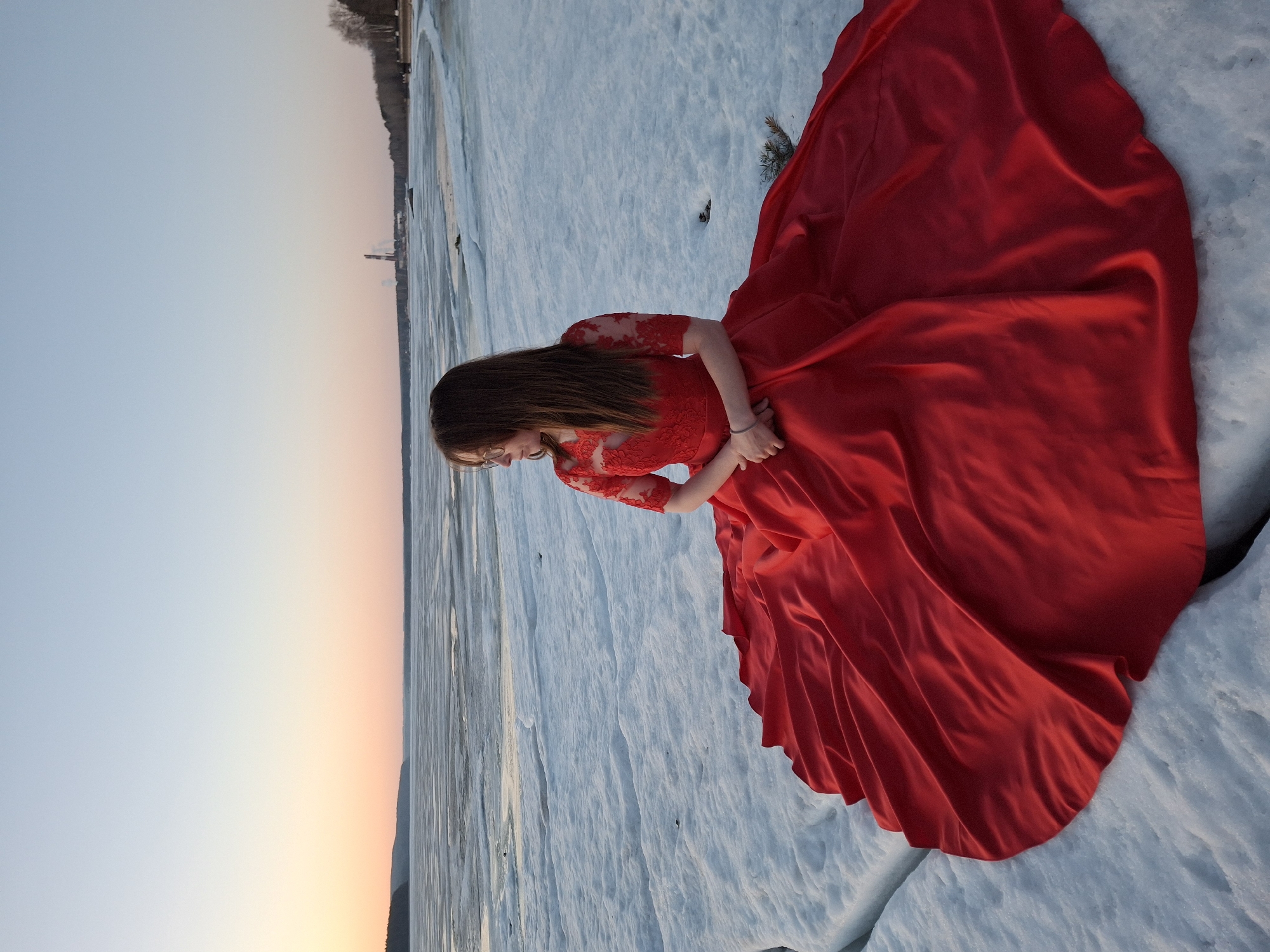 A woman wearing glasses and a long red dress is standing on a large, flat, snowy surface at sunset. In the background, one can make out a cityscape with a building silhouette and a smokestack, placing the scene in Chaikovsky, Russia. The snowy ground appears to be a frozen river or lake. The woman is positioned towards the right of the frame, with her flowing dress spreading across the ice and snow. Her gaze is directed downward. The sky behind her shows a gradient of colors, indicative of a sunset or sunrise.