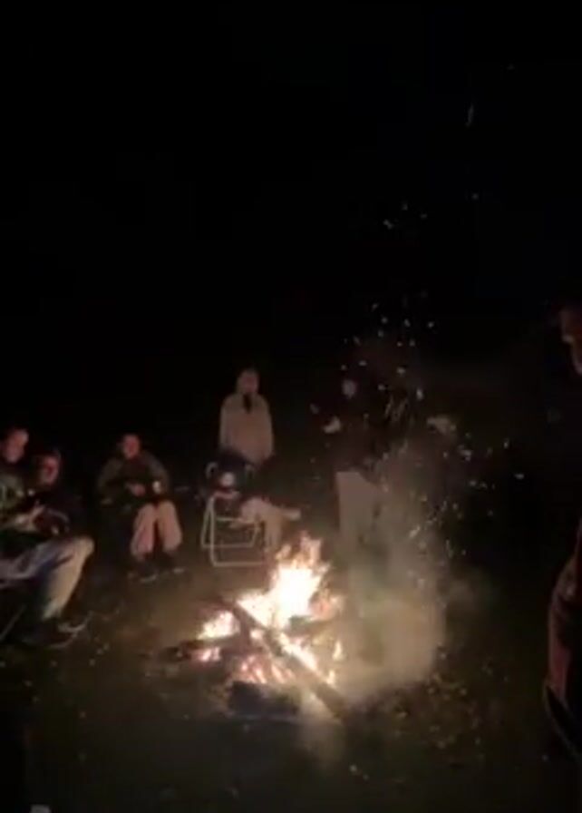 At night, a group of people are gathered around a bonfire