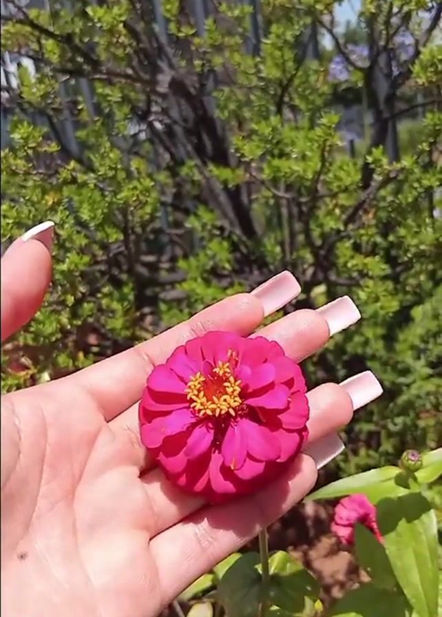 A close-up shot shows a pink flower resting on an open palm. The flower is a vibrant pink with a center of bright yellow. The person's nails are long and painted white at the tips. The background features lush green foliage, appearing to be a garden setting. A metal fence-like structure is also visible behind the plants. The light suggests it's daytime.