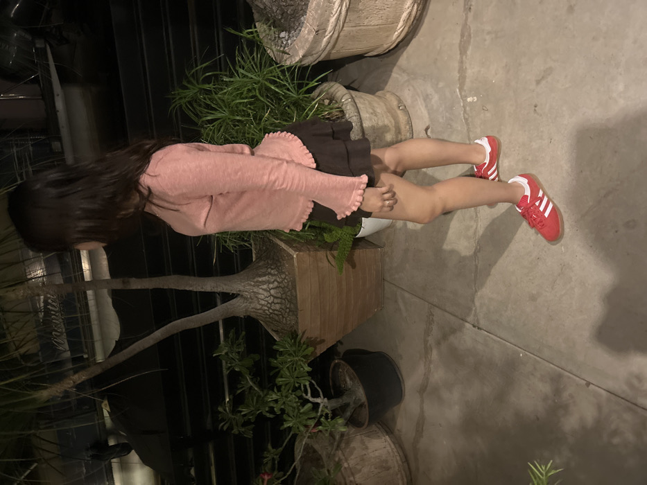 A person with long, dark hair wearing a pink, long-sleeved ruffled top and a dark brown skirt stands on a concrete surface. Red sneakers with white stripes adorn their feet. The person is positioned next to a variety of potted plants, including a spiky-trunked plant and leafy greens. The background features dark metal gates and structures.
