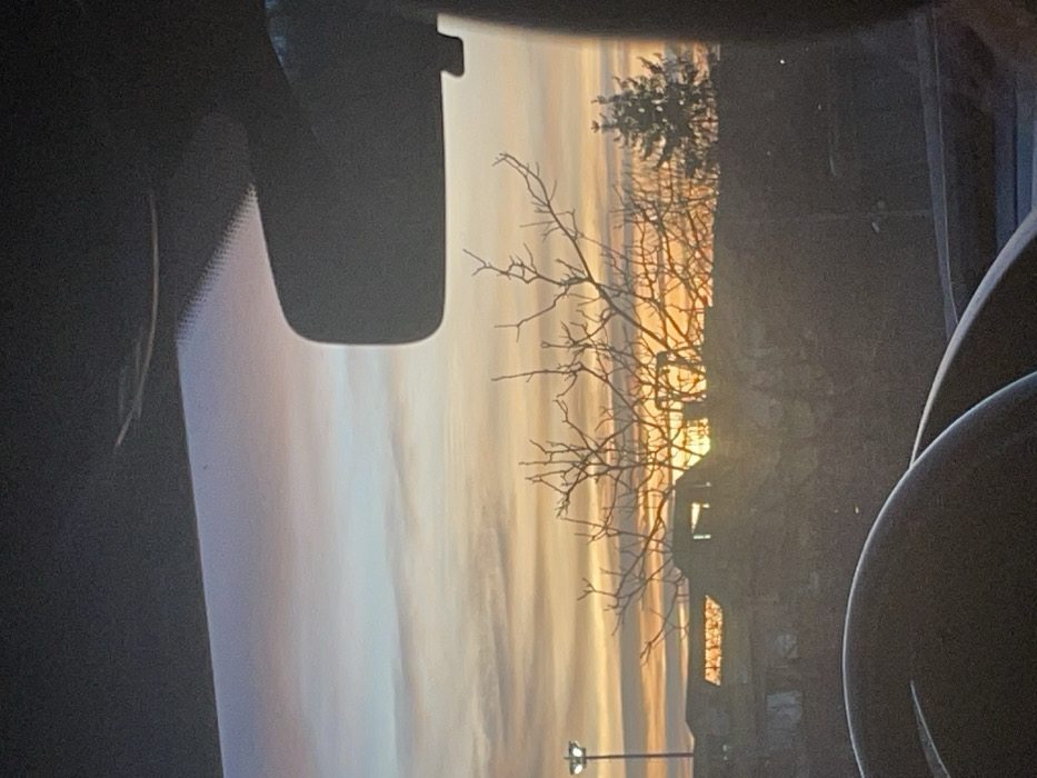The image depicts a golden sunrise or sunset viewed through a car window. Silhouetted branches of a tree reach upward against the sky's vibrant hues. A streetlight stands below. Interior car elements, including the rearview mirror and the steering wheel, frame the outdoor scene, creating a sense of being inside a vehicle.