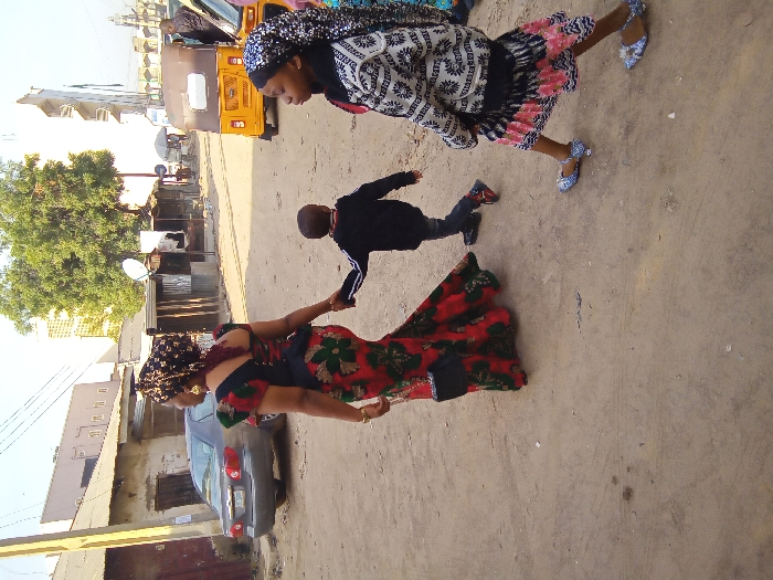 An outdoor scene in Tudun Wada, Nigeria, depicts three individuals walking along an unpaved dirt road under clear daylight conditions