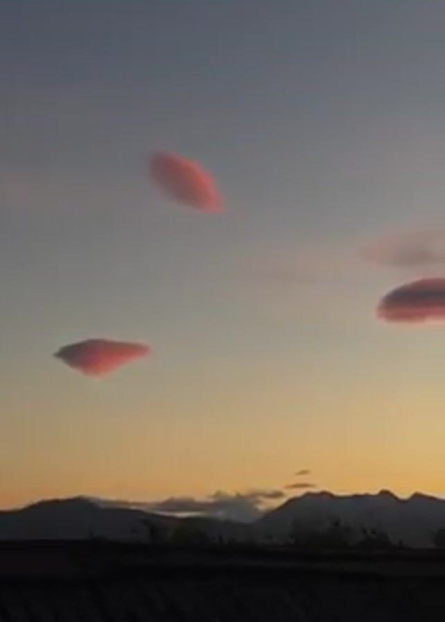 The video captures a picturesque scene at sunset, featuring lenticular clouds in the sky