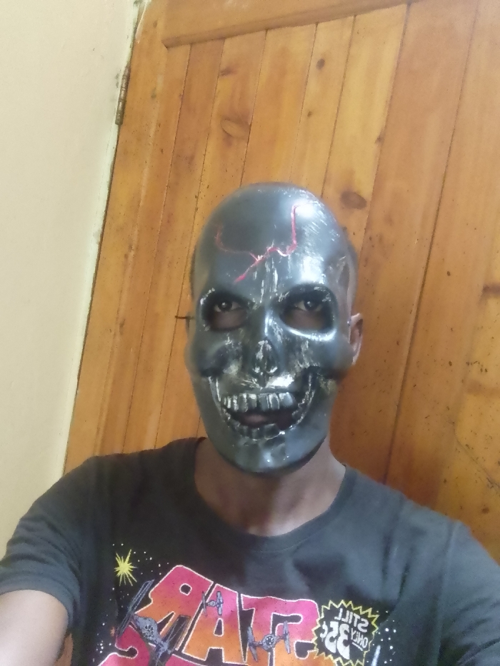 A single individual is depicted indoors in the city of Ziwa La Ng'ombe ward, Kenya. The subject wears a dark grey, skull-shaped mask with visible eyeholes revealing human eyes. The mask features a simulated nasal cavity and exposed teeth in the mouth area. Red, cracked-line patterns are present on the mask's forehead and upper facial regions. The individual is wearing a black t-shirt with a graphic design featuring the "STAR WARS" logo, various starships, and the mirrored text "STILL HERE." The background consists of a light beige wall on the left and a vertical-plank wooden door or paneling on the right, with a visible metallic hinge connecting it to the wall. The subject is oriented directly towards the camera.