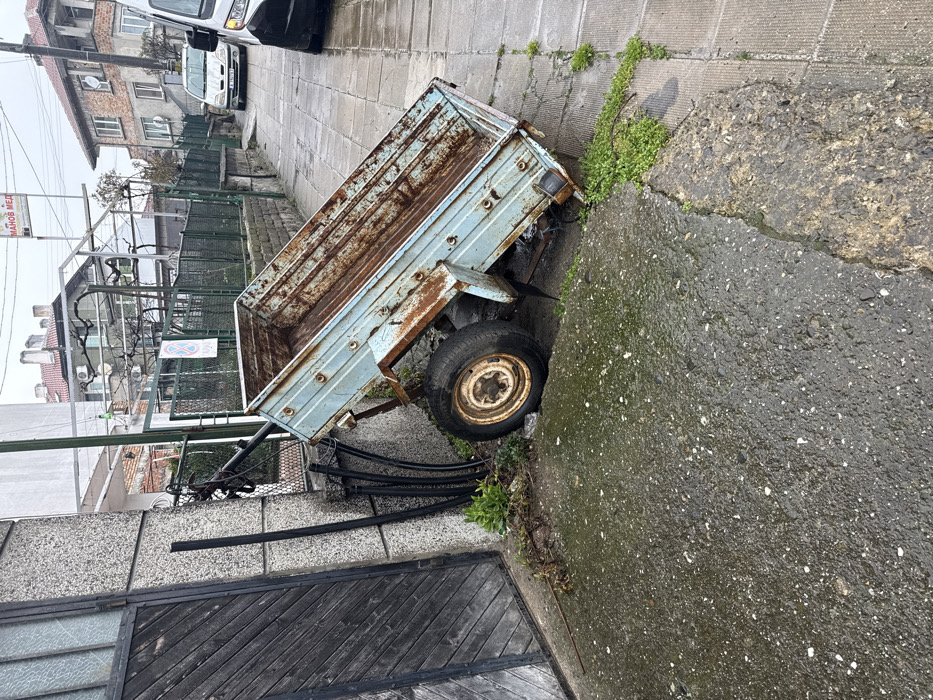 The image displays a street scene in Tsarevo, Bulgaria, under an overcast sky, with visible moisture on ground surfaces. The primary subject is a severely rusted, light-blue, two-wheeled utility trailer, positioned at an upward angle, with its bed tilted towards the left foreground. Its single axle and black-tired, off-white steel rimmed wheels rest on a patch of dirt and sparse green vegetation next to a concrete sidewalk. The trailer's interior bed is heavily corroded with deep orange-brown rust. To the left, a dark brown, vertically slatted wooden gate with a metal frame abuts a light-grey, textured building facade. Several black flexible pipes or cables are coiled and lean against this wall near the gate. Green weeds and grass sprout from the base of the gate and around the trailer. The ground in the immediate foreground is a dark, wet, granular asphalt or concrete surface. To the right of this, a wet, paved sidewalk constructed of rectangular concrete slabs extends into the mid-ground, showing cracks and further patches of green vegetation. In the mid-ground, beyond the trailer and sidewalk, a green metal mesh fence runs along the property line. Attached to this fence is a white circular sign with a red border and a diagonal red line, indicating a "No Parking" or "No Stopping" restriction. Behind the fence, residential buildings with stucco walls, brick accents, windows, and balconies are visible. Some buildings feature external air conditioning units. Trellises with bare vines are present in some yards. Further down the street, a light-colored sedan is parked on the right, and the front section of a white van is partially visible in the far right foreground. Overhead, a white sign with blue Cyrillic text, "МАНОВ МЕД," is mounted on a structure. A utility pole with wires is visible in the background. No people are present.