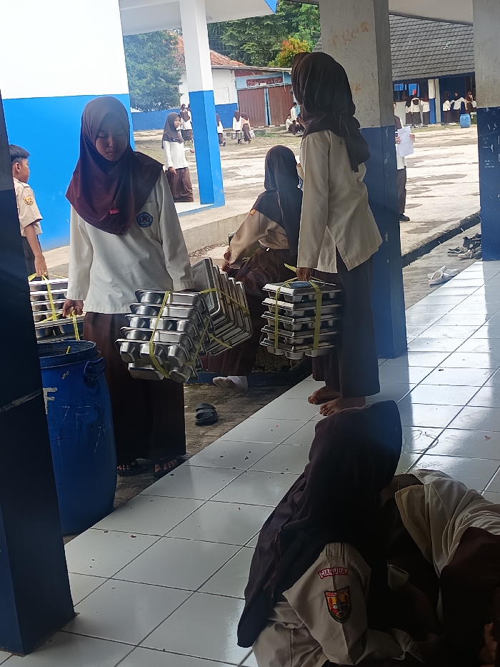 Several girls wearing hijabs and school uniforms are carrying stacks of metal trays held together by yellow straps. They appear to be moving the trays from one location to another. One girl is leaning against a wall, while others are visible in the background. The scene takes place on a tiled floor in an outdoor covered area. A blue barrel is on the left.