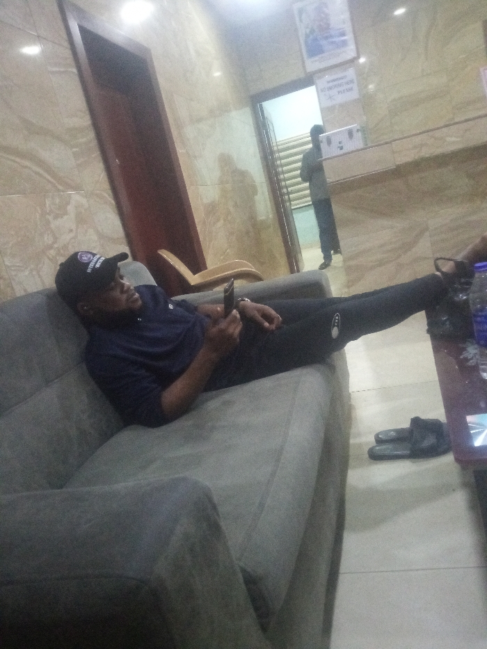 The image depicts an indoor waiting area or reception within a building in the city of Unknown, Unknown. A male individual is reclining on a grey upholstered sofa in the foreground, positioned with his body angled toward the right. He wears a dark blue long-sleeved shirt, black trousers, and a black baseball cap with a white logo, and is holding a black smartphone with both hands, looking down at the screen. His feet, clad in dark sandals, are propped on a dark brown rectangular table to his right. A clear plastic water bottle with a blue cap and a pair of black slide sandals are also present on the table and floor, respectively, near his feet. In the mid-ground, a second male individual stands partially visible in an open doorway, wearing a light shirt and dark trousers, facing into the room. The room features light-colored patterned tiled walls and a light-colored tiled floor. Two dark wooden doors are visible, one in the mid-ground to the left, and the other opening to a staircase in the background on the right. Overhead lighting illuminates the scene. A counter is visible in the mid-ground, above which a framed poster and a "NO SMOKING HERE PLEASE" sign are affixed to the wall. A light-colored wooden chair is partially visible near the left doorway.