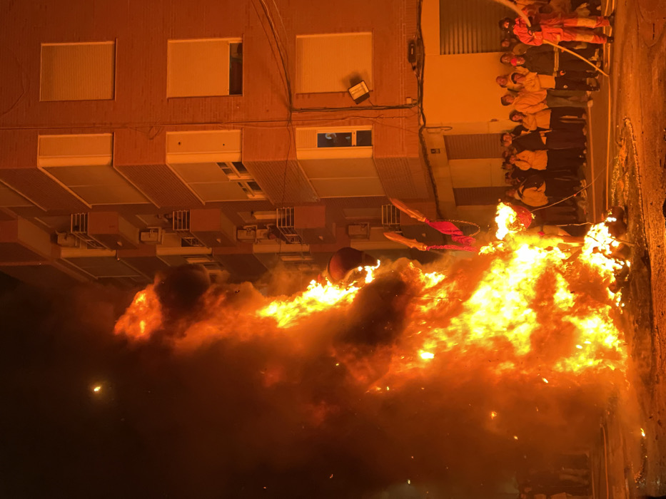 In Paiporta, Spain, an nighttime urban scene depicts a large, intense bonfire on a paved street, consuming a towering effigy or sculptural structure