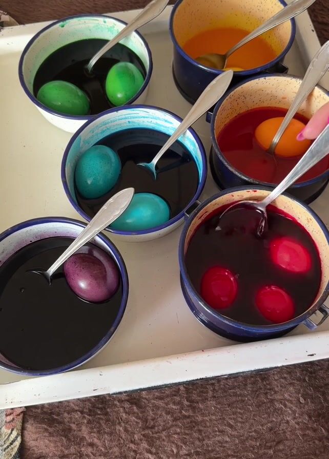 A close-up, static shot depicts a white tray holding six small bowls filled with colored water and eggs. Each bowl contains a different color: green, blue, purple, red, orange, and a second red. A spoon rests in each bowl. A woman's hand with pink nail polish is using a spoon to retrieve a blue egg from the blue liquid. The tray sits on a brown, patterned surface.