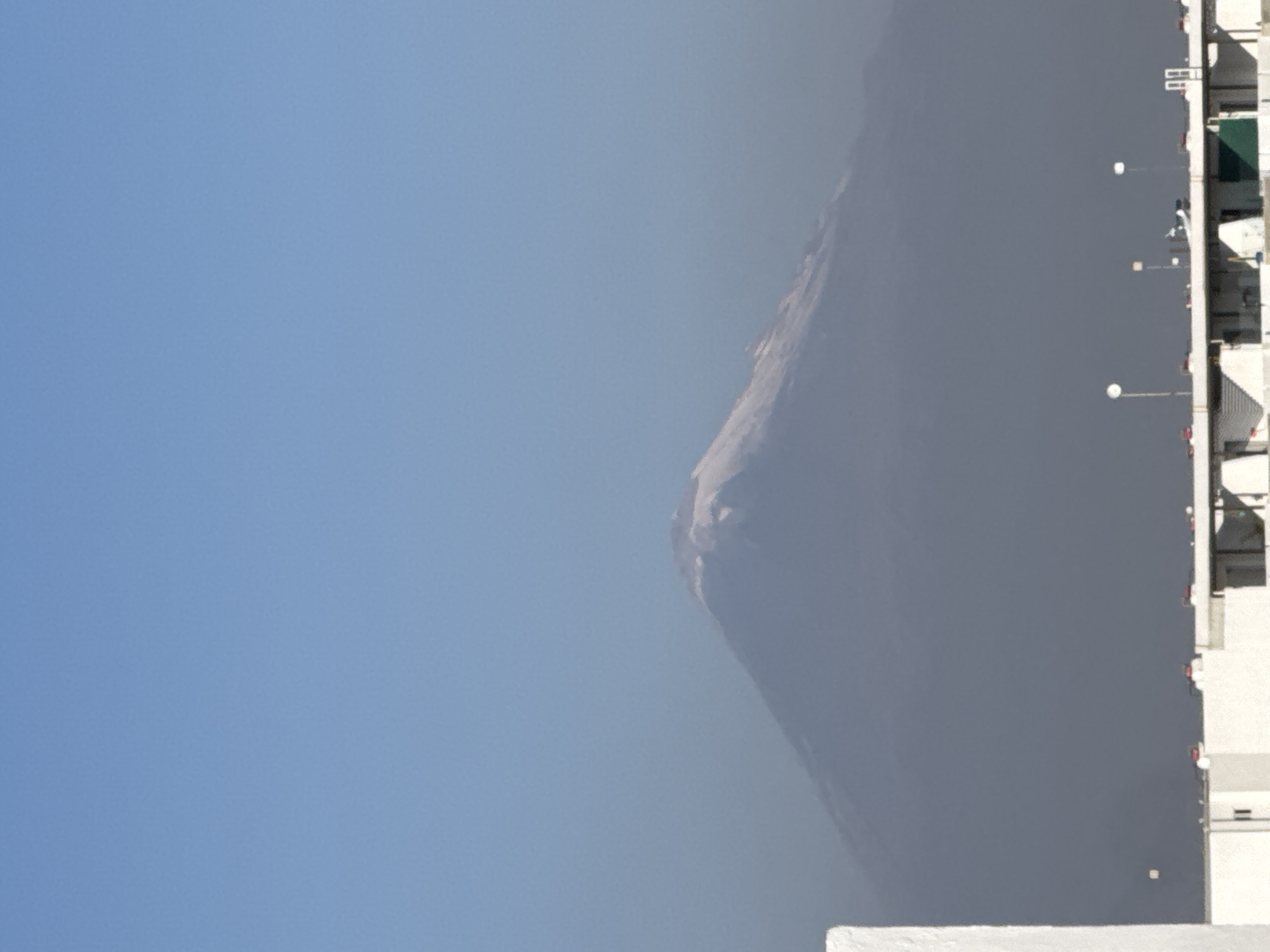 The image presents a distant, elevated view of a snow-capped volcano, identified as Popocatépetl, situated over the rooftops of San Francisco Ocotlán (Ocotlán), Mexico, under a clear, light blue sky. The upper conical peak of the volcano is distinctly white with snow, while its extensive lower slopes appear dark grey-blue, heavily obscured by atmospheric haze. In the immediate foreground, a series of flat, light-colored rooftops of buildings are visible, featuring white parapet walls and various rooftop equipment. This equipment includes multiple spherical white lights on poles and several reddish-brown fixtures, possibly vents or small structures. A prominent, partial white rectangular building element is present on the far left, while a small dark green rectangular object is visible on a rooftop section to the far right. No individuals, animals, or explicit actions are depicted.