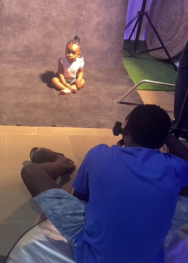 A photographer is taking photos of a baby in a studio. The baby is sitting on a grey backdrop and is wearing a pink and white outfit. The photographer is sitting on the floor in front of the baby, wearing a blue shirt and patterned shorts. The studio has a light stand, a round decorative item, and green artificial turf. The photographer has his back to the camera and is holding a camera up to his eye.