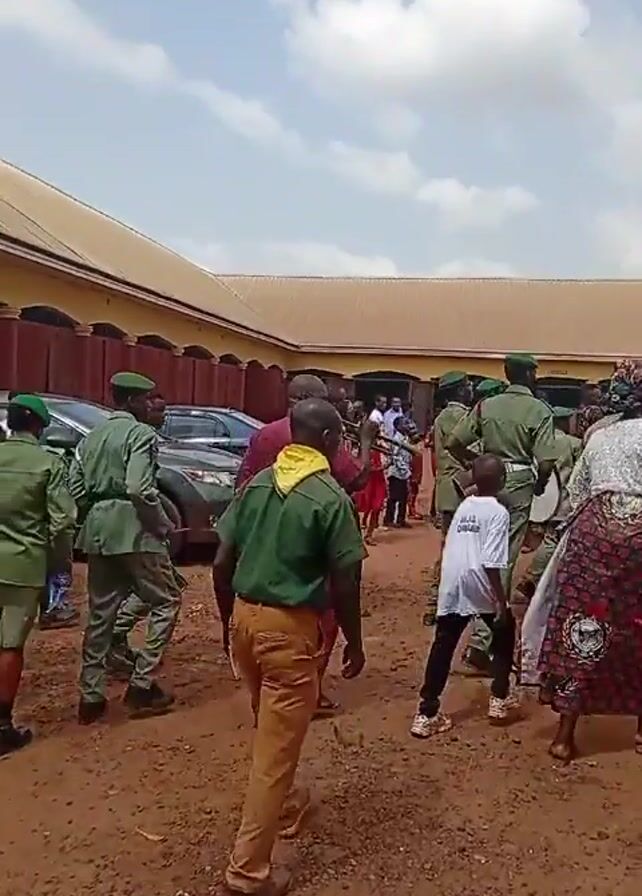group of people walking on a red dirt surface. Some of the people are wearing green uniforms, while others are in civilian clothing. There are cars parked in the background, and a building with a tan roof is also visible. The sky is blue with some clouds. There's music playing.
