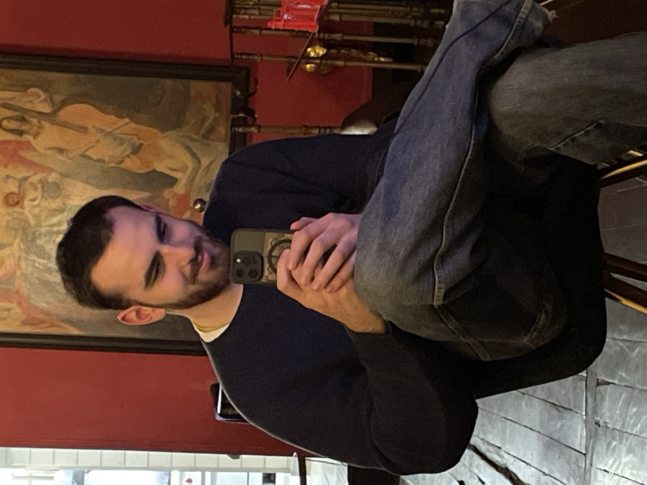 A single male subject, approximately 20-30 years old, with dark hair and a beard, is depicted seated indoors. He wears a dark blue long-sleeved sweater, a gold chain, and light blue jeans. His legs are crossed, and he holds a dark-cased smartphone (featuring a prominent triple-lens camera module) with both hands, looking down at its screen with a slight smile. The background consists of deep red walls. On the right, a large, dark-framed painting or mural displays multiple human figures in light, muted tones, one appearing to play a stringed instrument resembling a cello or double bass. To the left, a blurry reflection suggests a window or light source. To the immediate right of the subject, partially visible golden decorative metalwork and a red plastic crate are present. The floor is composed of rectangular, light-colored, possibly wooden or tiled planks arranged in a linear pattern. The subject is seated on a stool with visible wooden legs. The interior decor suggests a café, bar, or restaurant setting in Paris, France; however, the exact location within the city is not identifiable from the image.