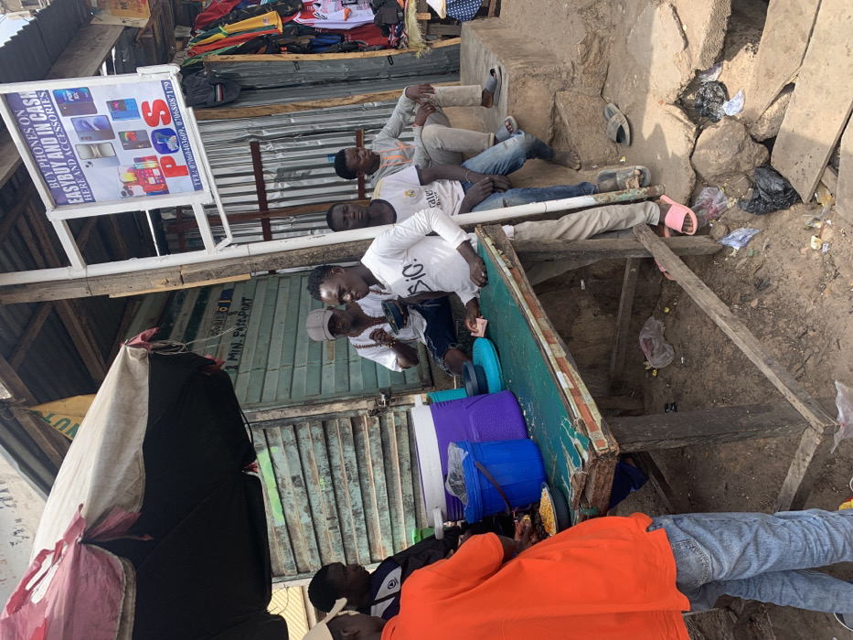 This image depicts an informal outdoor market scene in Jos, Nigeria, under bright daylight. Six adult males are visible within the frame. In the foreground, to the left, a man wearing an orange t-shirt and blue jeans stands with his back mostly to the camera, positioned behind a dilapidated wooden stall with a chipped green surface. On the stall, various containers are present, including a blue and a purple cooler, a blue bucket, and a bowl containing yellow kernels, possibly maize or rice. Next to him, partially obscured, is another man. To the right of the orange-shirted man, a man in a white long-sleeve t-shirt with "SIG" printed on it and light-colored trousers stands facing slightly left, holding what appears to be a stack of banknotes on the stall's surface. Further back and to the left of him, a man wearing a white short-sleeve shirt and a grey baseball cap is seated, eating from a dark bowl. Three additional men are seated on concrete steps to the right. The man closest to the center wears a white "REAL MADRID" t-shirt and blue jeans, with black sandals on his feet. Next to him, a man in a grey hoodie and light-colored trousers is also seated. Their feet rest on an uneven, unpaved dirt ground littered with plastic bags, wrappers, and general debris. An open, faded red and white umbrella provides shade over the left side of the stall. Behind the seated men and to the right, a white rectangular sign is prominently displayed, advertising "BUY PHONES ON EASYBUY AND IN CASH HERE AND ACCESSORIES" with images of various smartphones and the brand "P o S," along with two Nigerian phone numbers. Below this sign, a display of colorful clothing, including t-shirts and jerseys, hangs from a rack against a corrugated metal wall. Another corrugated metal structure with a partially visible sign reading "MIN. PA*S-PORT" is in the background to the left.