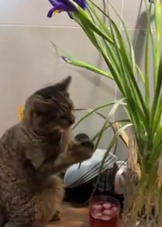 - "A striped tabby cat is playfully batting at a vase of iris flowers on a kitchen counter" by FM-MeaOo2, licensed under CC BY 4.0