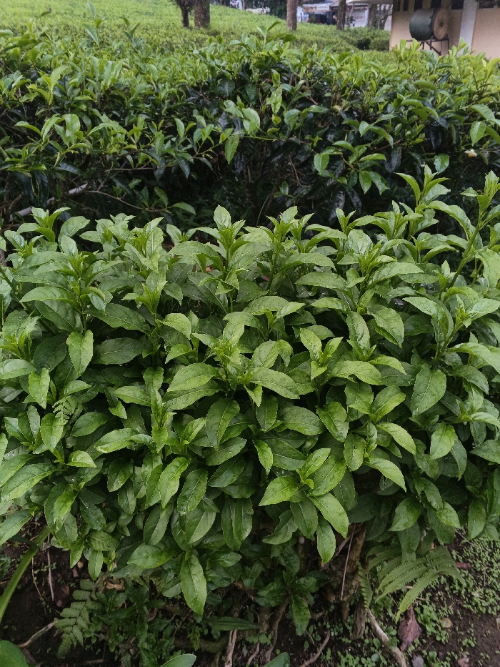The scene depicts an outdoor cultivated area in São Félix do Xingu, Brazil. The foreground is filled with dense, vibrant green foliage comprising numerous plant stalks with ovate, pointed leaves, consistent with tea bushes. Small water droplets are visible on the leaves. The immediate ground beneath these plants exposes dark soil, intertwining roots, and sparse patches of smaller green plants, including ferns. In the midground, another row of similar green plants forms a backdrop. The background includes distant green vegetation and trees on a slight incline. To the right, a light-colored building with a beige wall is partially visible, featuring a dark cylindrical object, consistent with a water tank or heater, mounted on its exterior. No individuals are present in the image.