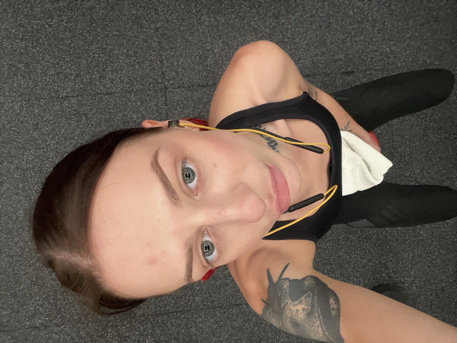 An individual, appearing to be a young adult female, is depicted from an overhead perspective, looking directly upwards at the camera. She has dark brown hair parted down the middle, light-colored eyes, and is wearing a black sports bra and black athletic leggings with subtle grey detailing. Yellow and black in-ear headphones are suspended around her neck. A white towel is clutched in her left hand, which has red fingernail polish. A dark-ink tattoo is visible on her left shoulder/upper arm, depicting an indeterminate subject. Another smaller marking or tattoo is present on the right side of her neck/collarbone area. The immediate environment consists of a dark grey, speckled, textured floor, consistent with an indoor gym or fitness facility. The specific city location of Munggu, Indonesia, cannot be visually confirmed from the provided image.