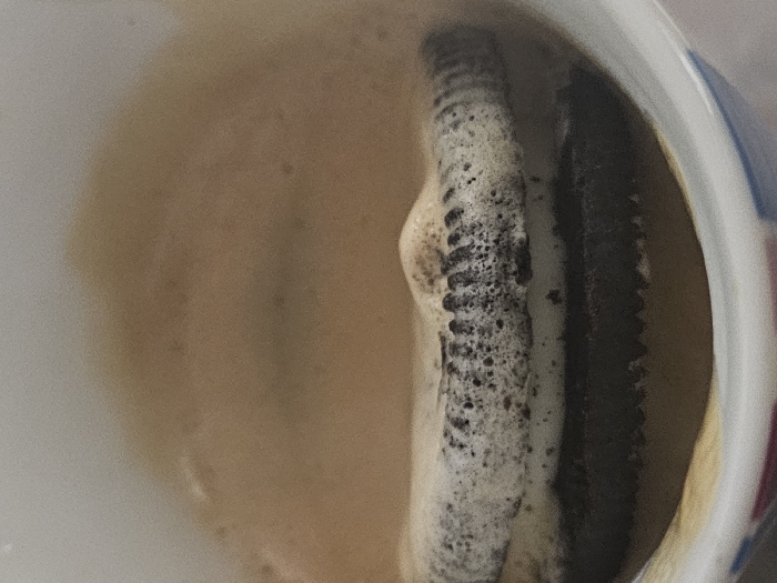 An overhead shot shows a mug filled with light brown liquid. Two chocolate sandwich cookies are partially submerged. The cookies are dark with a creamy filling and have a visible textured pattern. The liquid appears slightly frothy around the cookies. Part of the mug's rim is visible, showing a blue, white, and red design.
