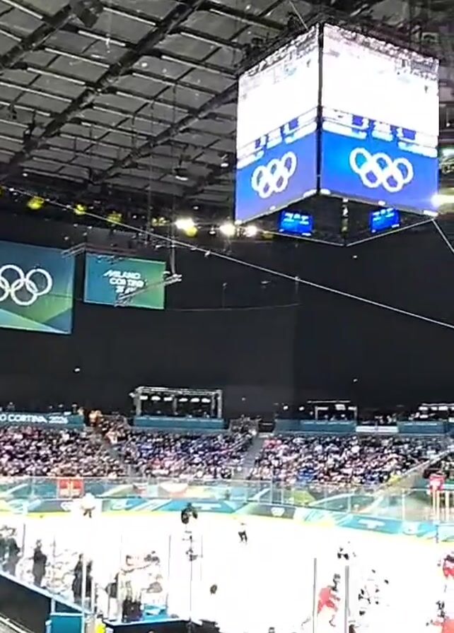 A video captures an ice hockey game in a large arena under bright spotlights. Above the ice, a large square screen displays the Olympic rings, and banners promoting "MILANO CORTINA 2026" are visible in the stands. A large crowd fills the seats, with many people in attendance. The hockey players, wearing contrasting jerseys, skate across the ice, engaged in the game. The atmosphere seems intense as a goal is scored, and the crowd erupts in cheers.