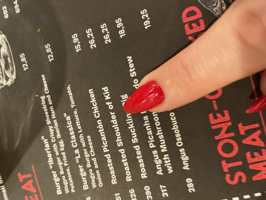 A restaurant menu features various meat dishes. "Burger Iberian" with crispy shoestring potatoes, fried egg, Iberian ham, and cheese is priced at 12.85. "Burger La Classica," made with Wagyu beef, lettuce, tomato, and onion, also costs 12.85. Roasted Picantón Chicken is 15.95, and Roasted Shoulder of Kid is 26.25. Roasted Suckling Pig is also 26.25, while Angus Picanha with mushroom stew is 18.95. Angus Ossobuco is priced at 19.25. A red nail is pointing at Roasted Suckling Pig. The menu section title reads "STONE- MEAT".