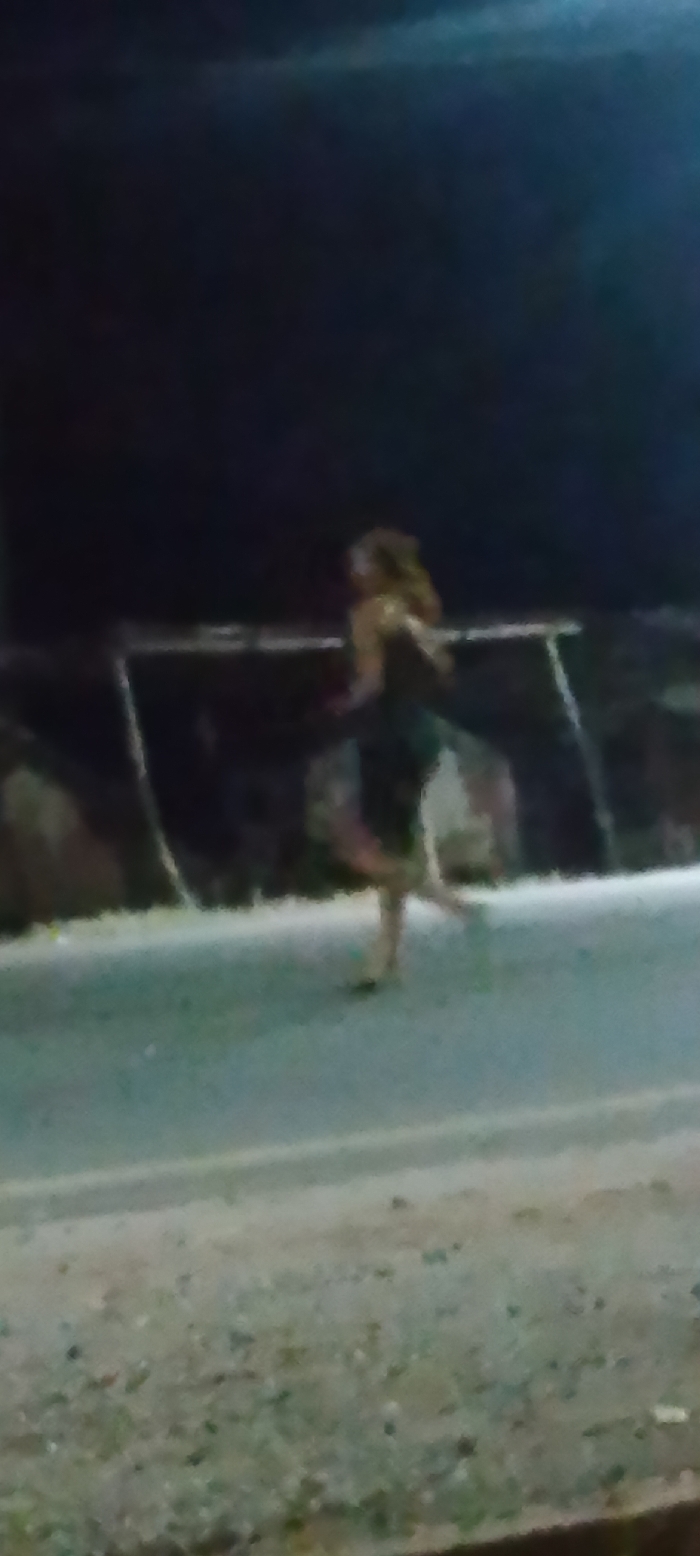 A blurry, low-light image captures a nocturnal scene in the city of Zango-ndaji, Nigeria. A single individual is depicted in motion on a paved surface, likely a road. The person, with visible light-colored or curly hair, is wearing a dark upper garment and a patterned lower garment (skirt). They are captured mid-stride with one leg lifted, suggesting a running or dynamic walking action. The paved surface extends through the foreground and midground, bordered on the viewer's left by a darker, unpaved shoulder area. In the background, indistinct horizontal structures, possibly a fence or railing, are visible against a dark, featureless sky. The scene is characterized by dim ambient lighting and significant motion blur.