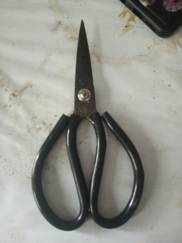 - "A pair of utility scissors, featuring dark, heavily rusted metal blades and black, worn handles, lies on a stained, light-colored surface in the city of Balapur, India" by FM-3mobU2, licensed under CC BY 4.0