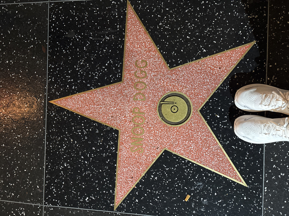 - "A top-down shot displays Snoop Dogg's star on the Hollywood Walk of Fame, a pink star with gold trim and a record player symbol" by FM-97btd2, licensed under CC BY 4.0