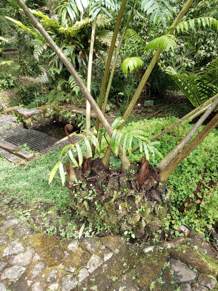 The image displays a verdant, semi-cultivated botanical environment located within Đà Nẵng, Vietnam, likely a section of a botanical garden or nature reserve. The foreground shows a partial view of an irregular, moss-covered flagstone pathway on the left, transitioning to damp soil and sparse green ground cover on the right. Central to the foreground is the thick, fibrous, and heavily moss-encrusted base of a large fern or tree fern. From this base, multiple robust, segmented frond stalks extend upwards and outwards, exhibiting variations in color and texture. To the left of the main plant base, a single prominent, tightly coiled brown fiddlehead fern is emerging, alongside several partially unfurled green fronds. In the midground, towards the left, a dark, rectangular water feature, appearing as a shallow pond or channel, is visible, partially covered by a dark metal mesh grate. This water body is enclosed by weathered grey stone edgings. The ground immediately surrounding the central fern and the water feature is densely covered with small-leafed green groundcover plants. The background presents a dense tropical forest canopy, characterized by numerous large ferns, broad-leafed plants, and visible tree trunks, indicating a lush, humid ecosystem. A small, unreadable green plant identification sign mounted on stakes is faintly visible amidst the deep background foliage. No individuals, animals, or specific actions are depicted in the scene. The lighting suggests natural daylight, possibly diffused or overcast.