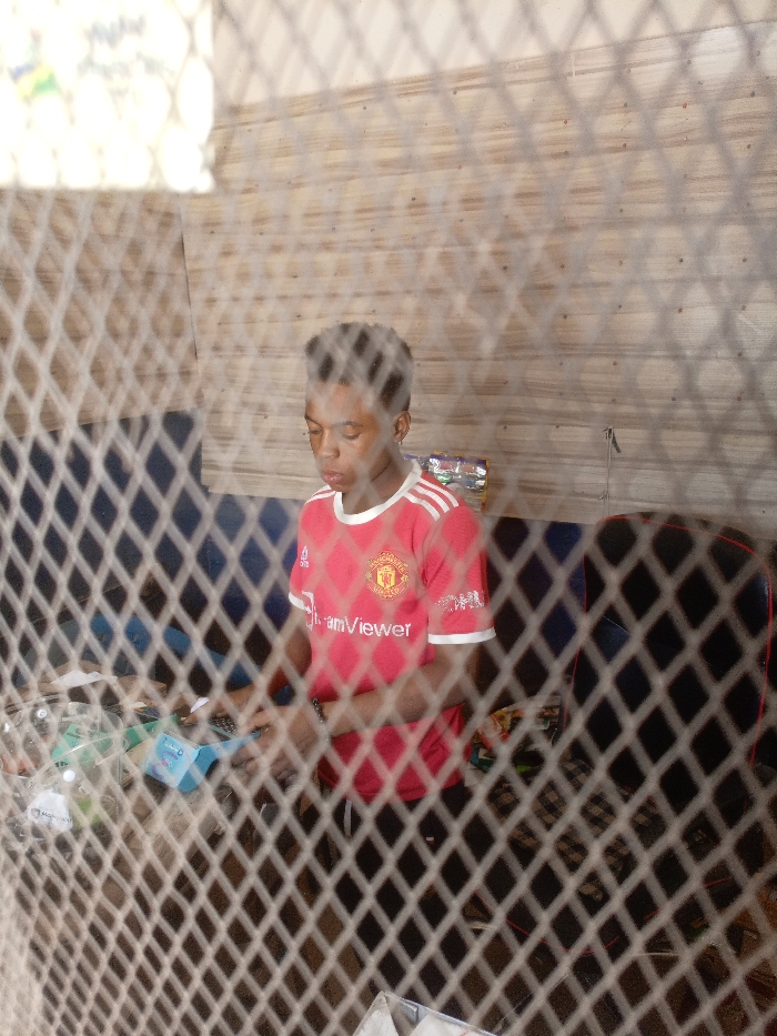 The image displays a young individual behind a diamond-patterned security mesh, within what appears to be a retail kiosk or small shop located in Panshekara, Nigeria. The subject, presenting with dark skin and short, dark hair, wears a red short-sleeved Manchester United football jersey with white trim, a club crest, and a "TeamViewer" sponsor logo. Their head is tilted downwards, and their hands are visible, appearing to manipulate a small blue object on a counter surface. Various small items, including a clear plastic bottle, are also present on this surface. In the background, to the subject's left, packaged goods are stacked on a shelf. The wall behind features light-colored horizontal wooden paneling above a darker blue section. A dark chair with red accents is partially visible to the subject's right. The scene is illuminated, suggesting an indoor or semi-enclosed environment.